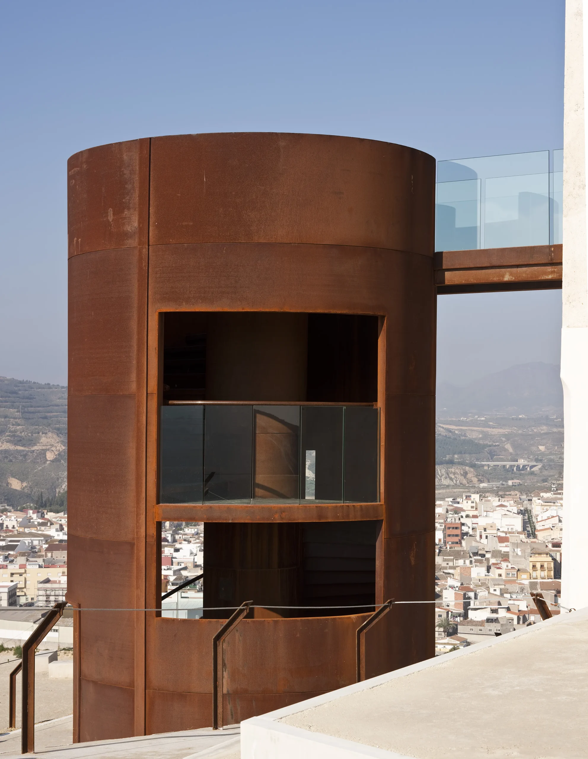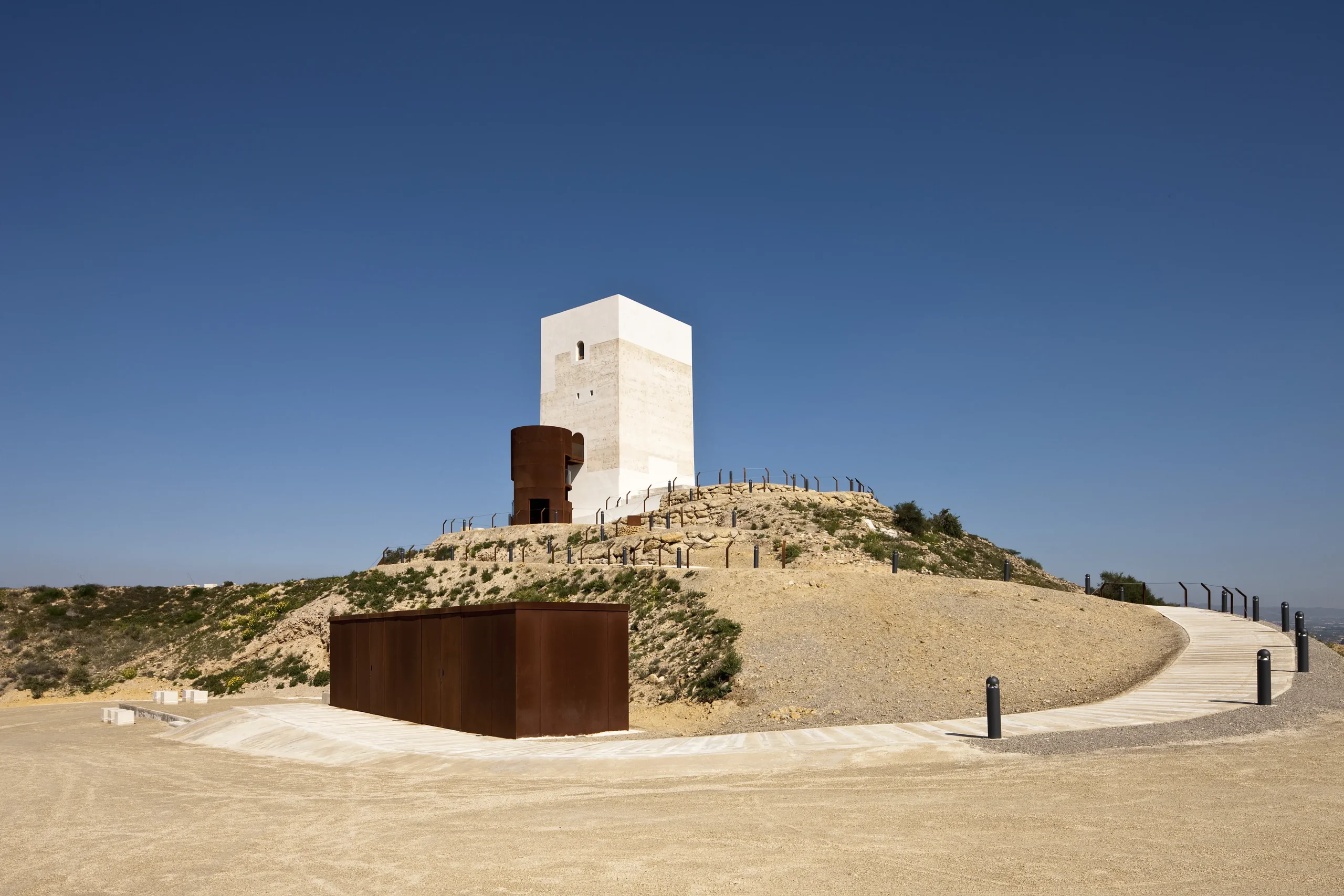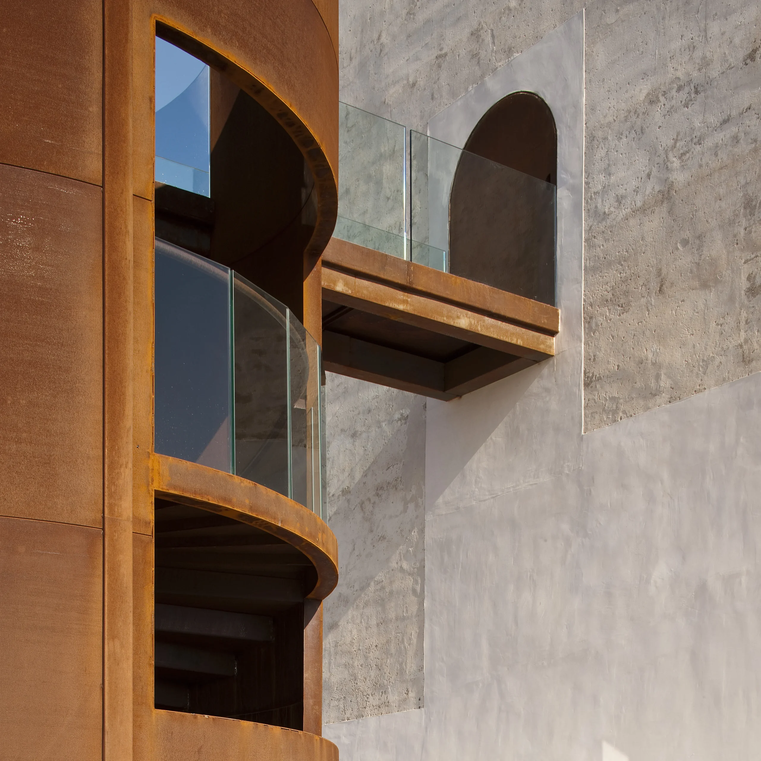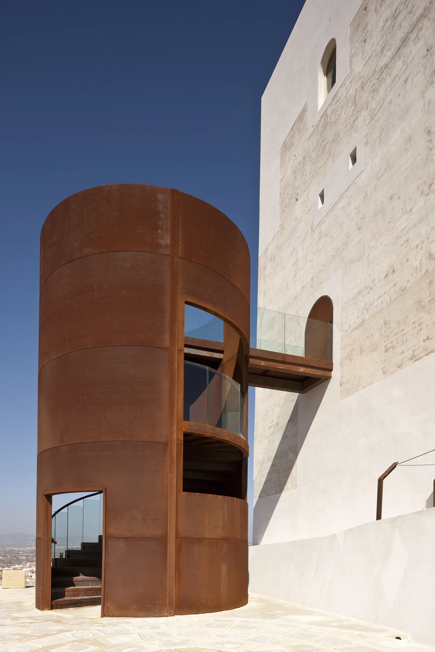 Para recuperar el acceso original a la torre, se ha diseñado una escalera de acero corten. Se trata de un objeto ligero y metálico, que contrasta con la materialidad de la construcción original. Frente a la solidez de las formas rectangulares de la torre, la escalera es un elemento circular y oxidado de naturaleza provisional.