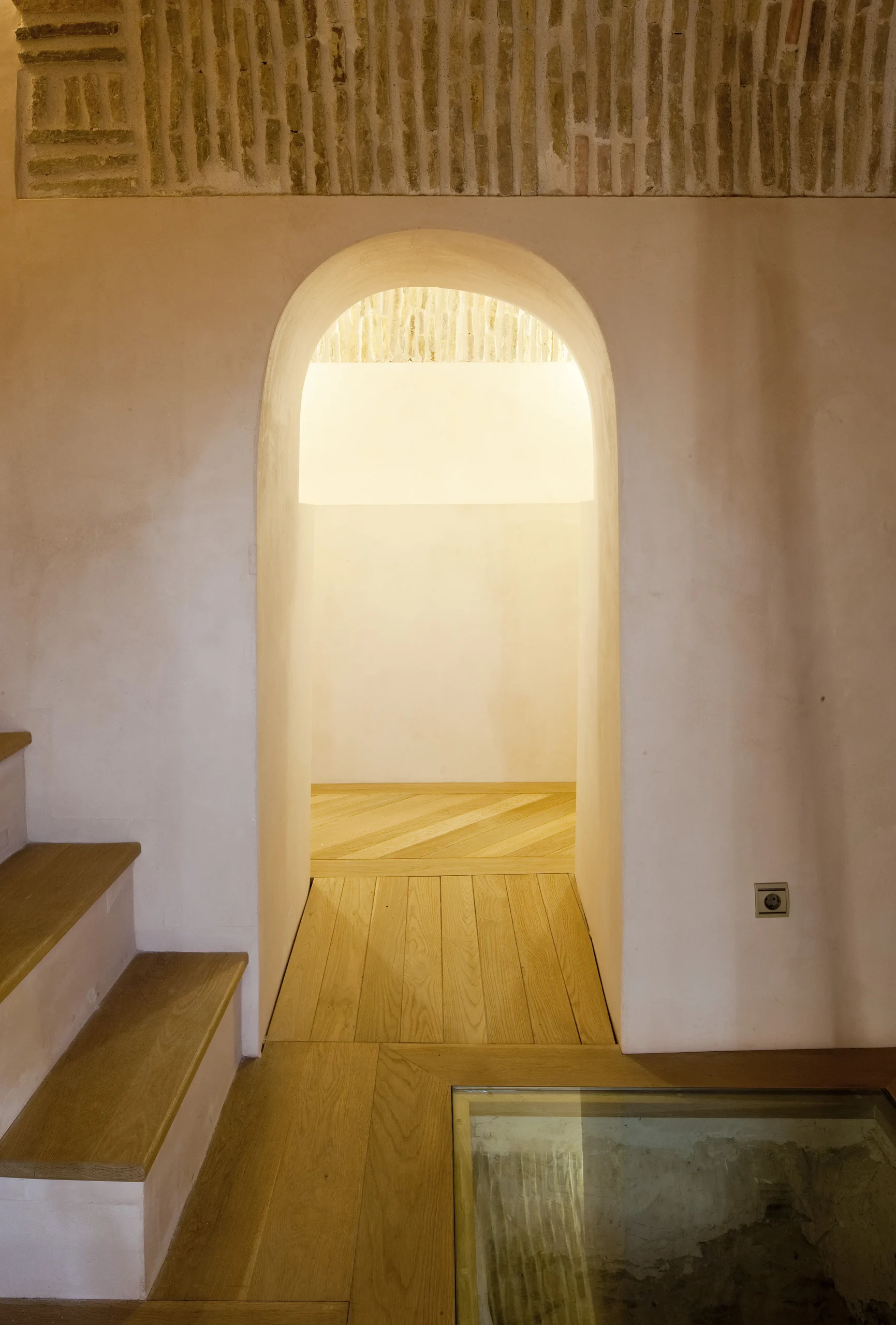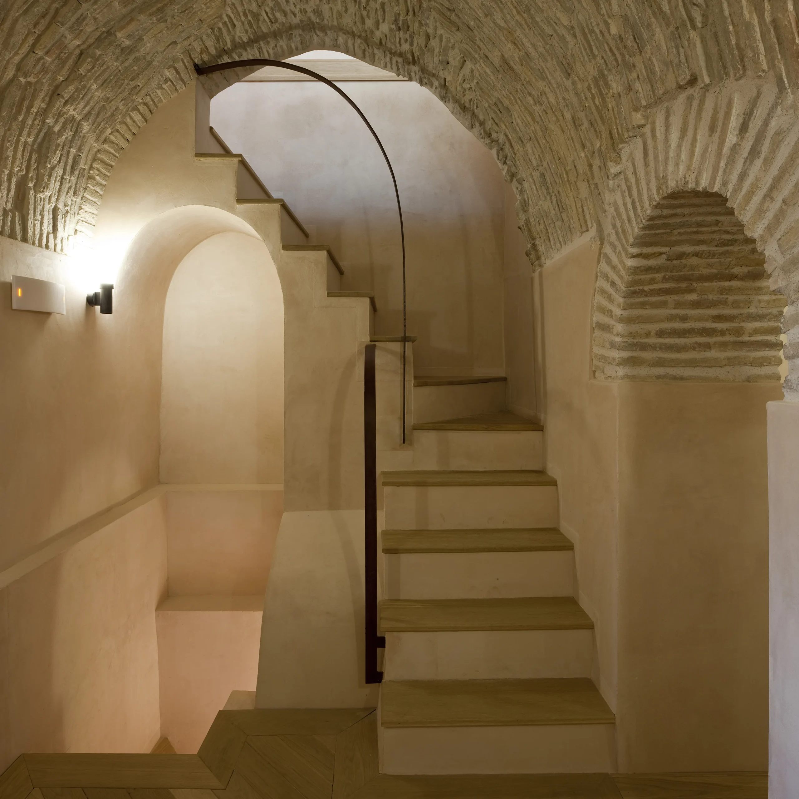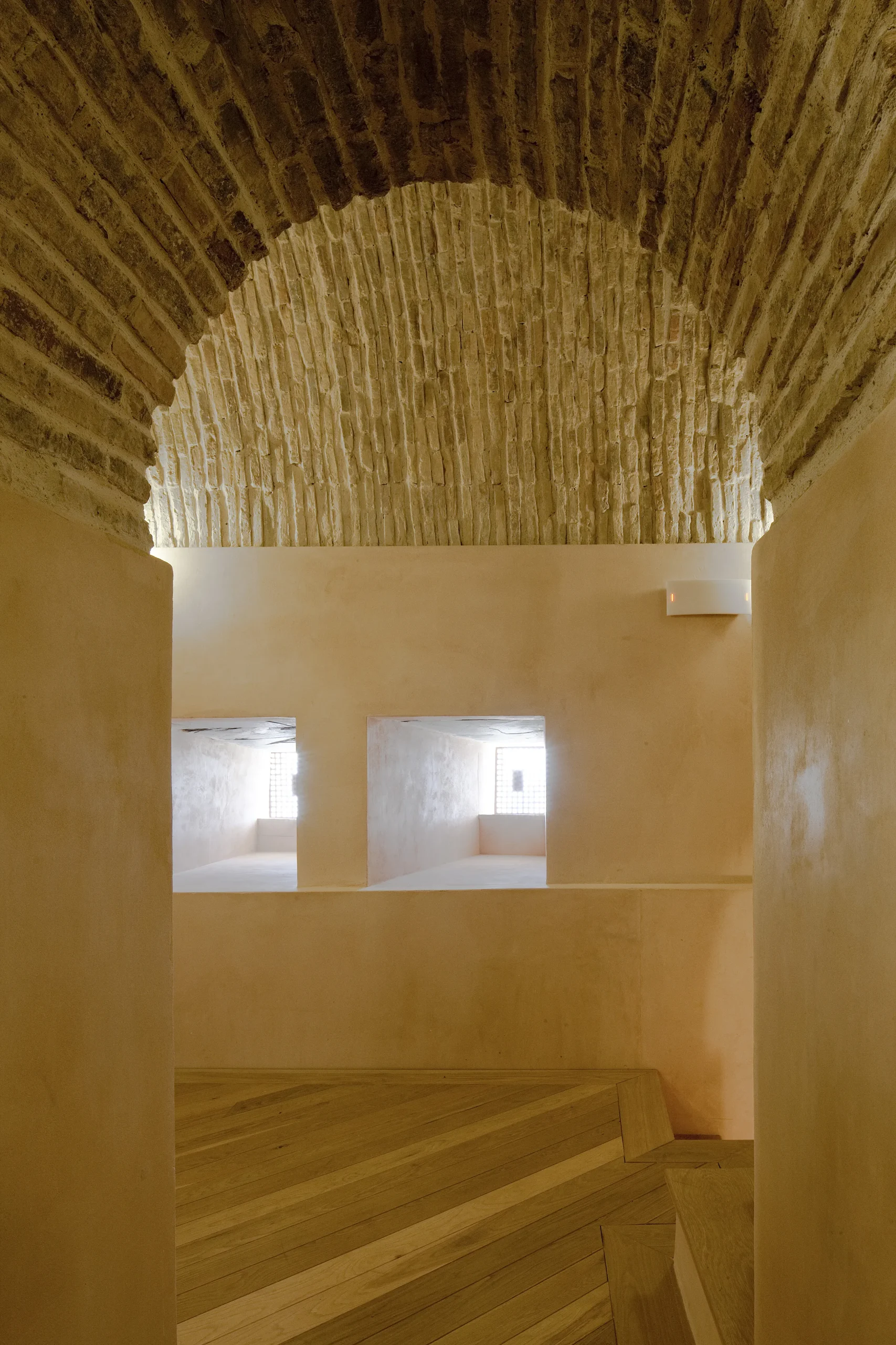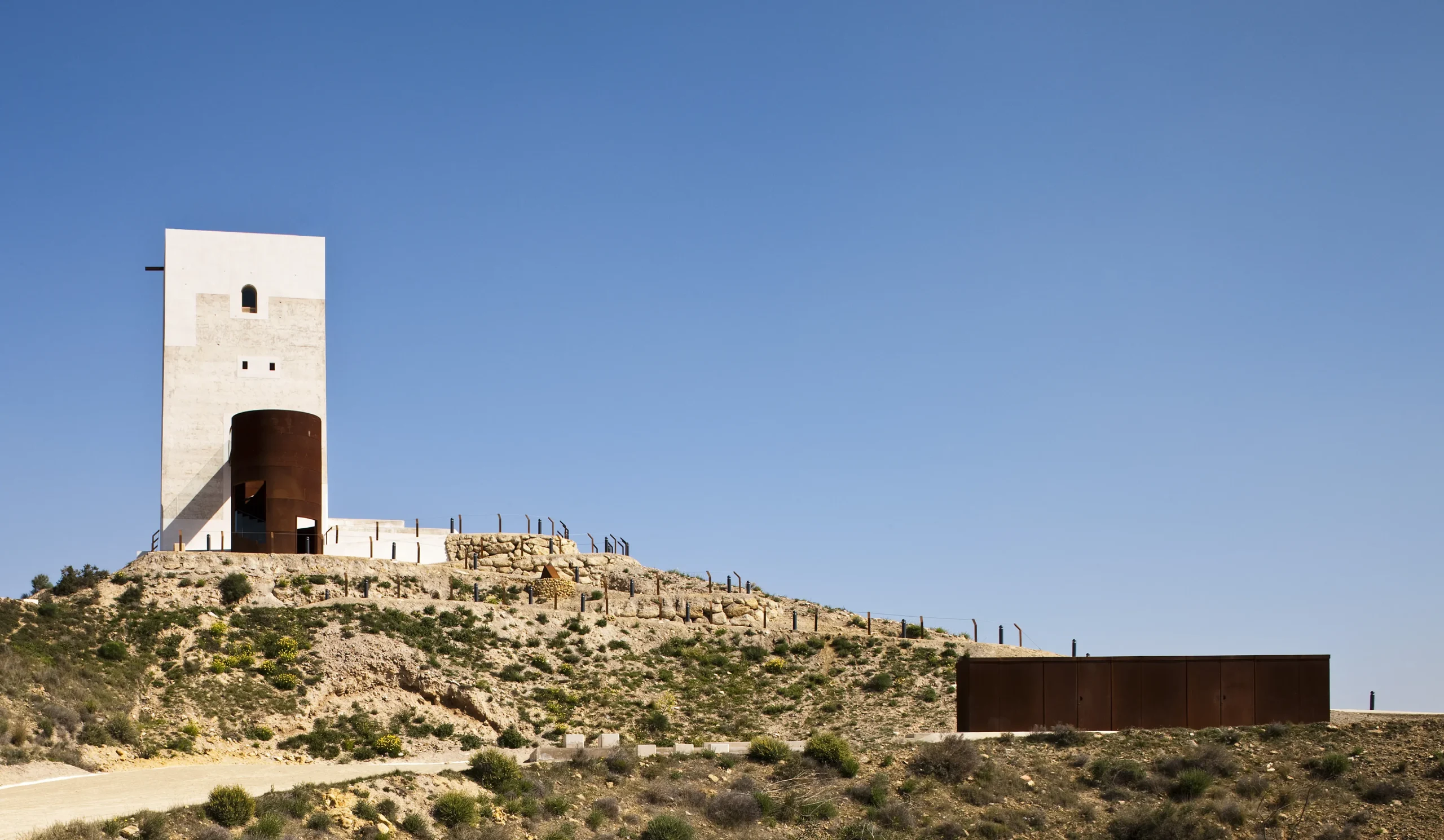 Para recuperar el acceso original a la torre, se ha diseñado una escalera de acero corten. Se trata de un objeto ligero y metálico, que contrasta con la materialidad de la construcción original. Frente a la solidez de las formas rectangulares de la torre, la escalera es un elemento circular y oxidado de naturaleza provisional.