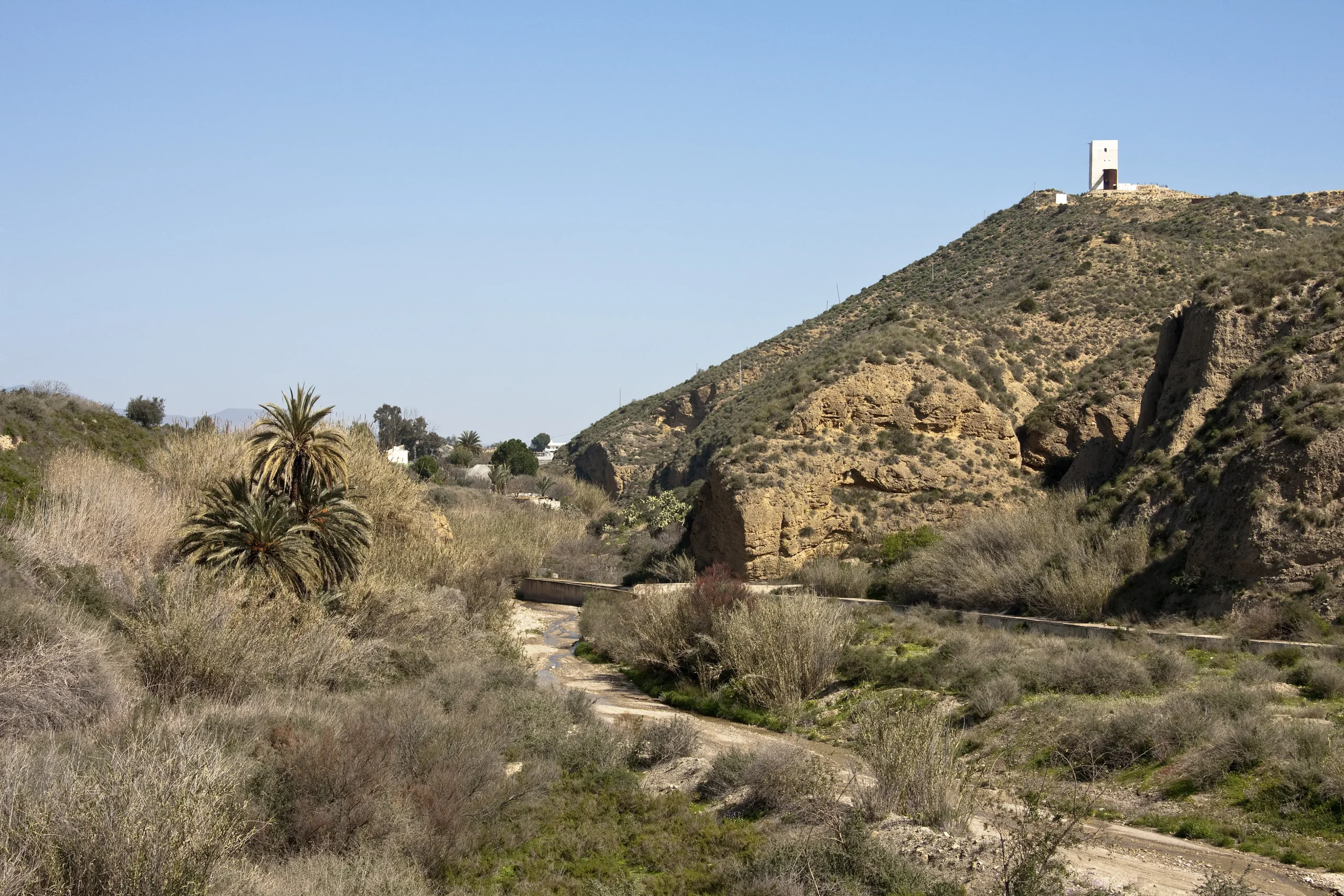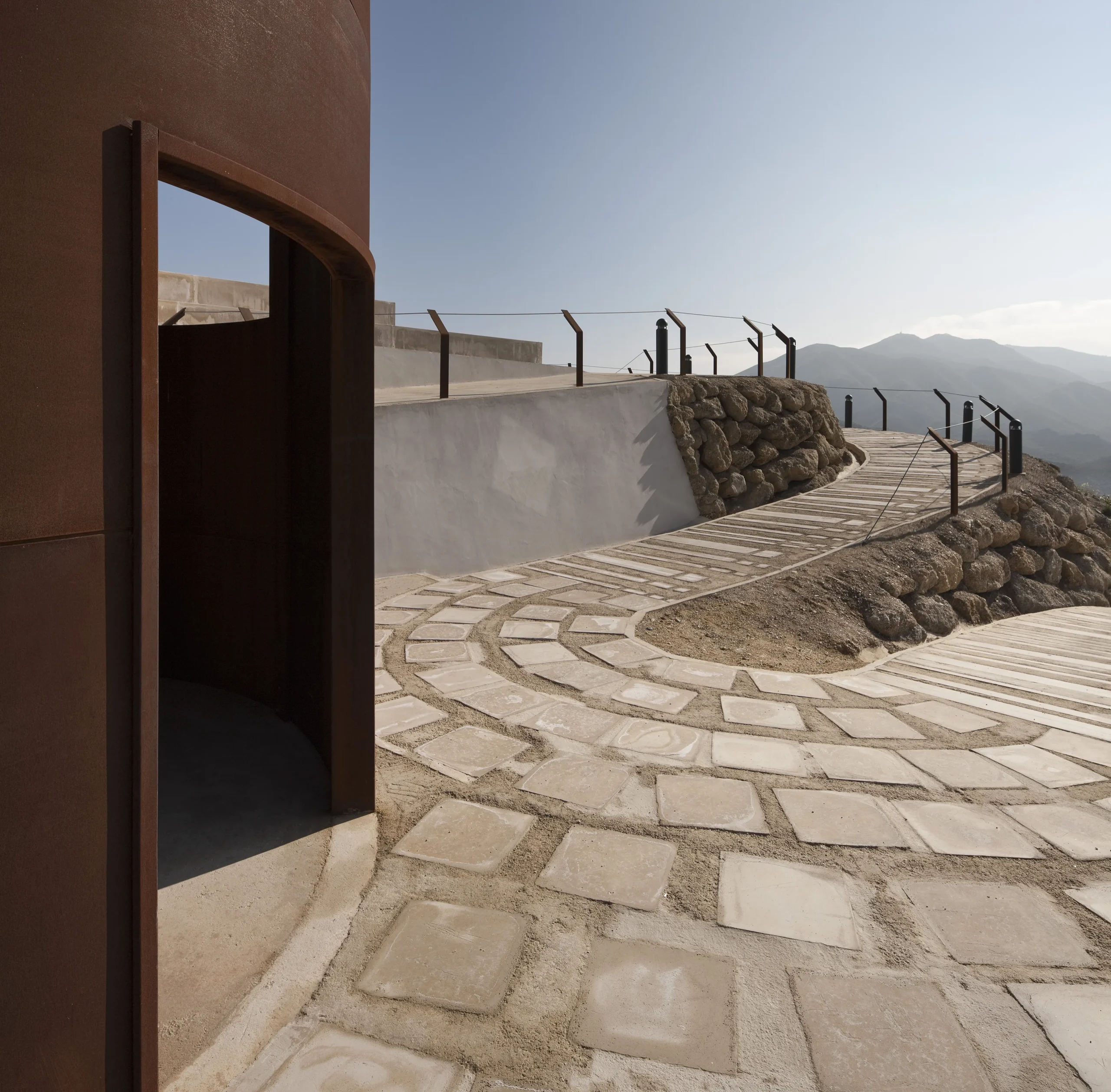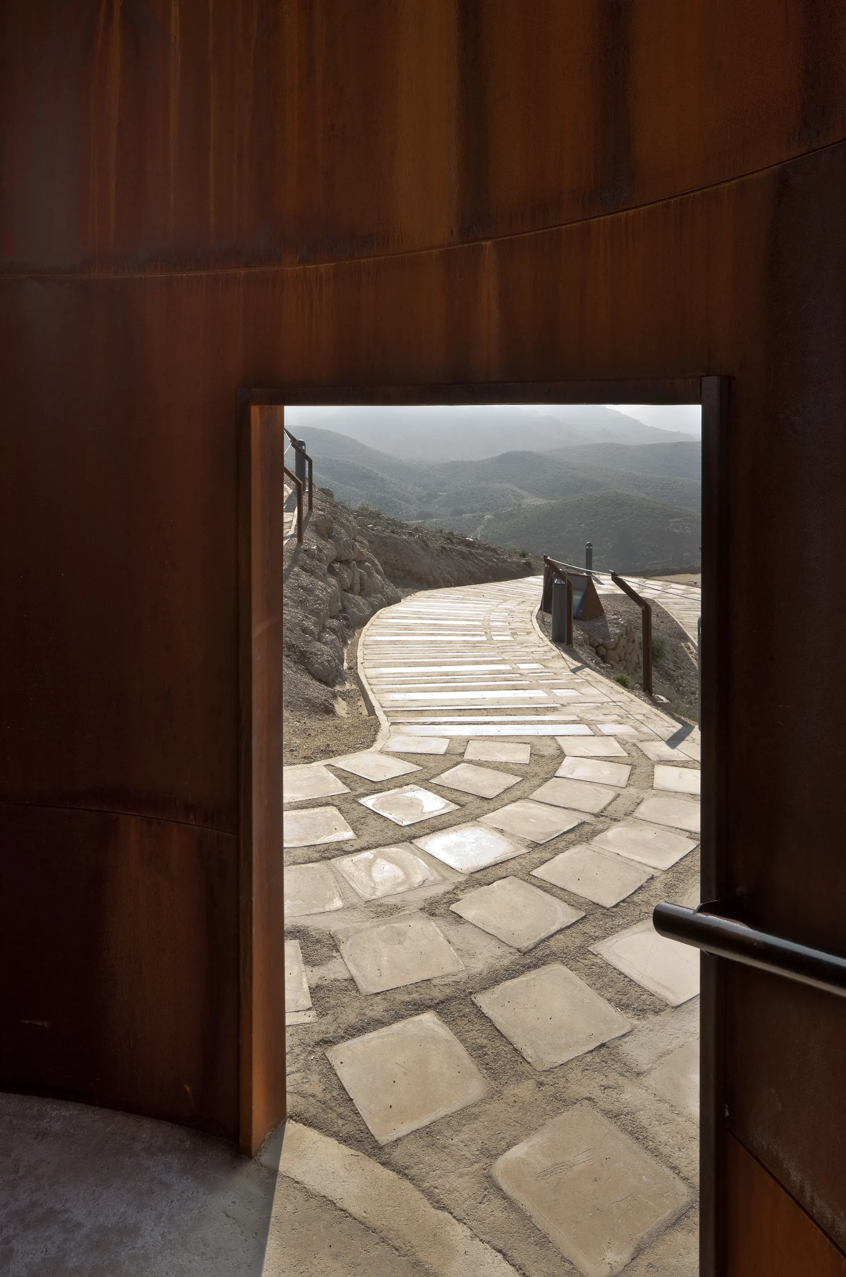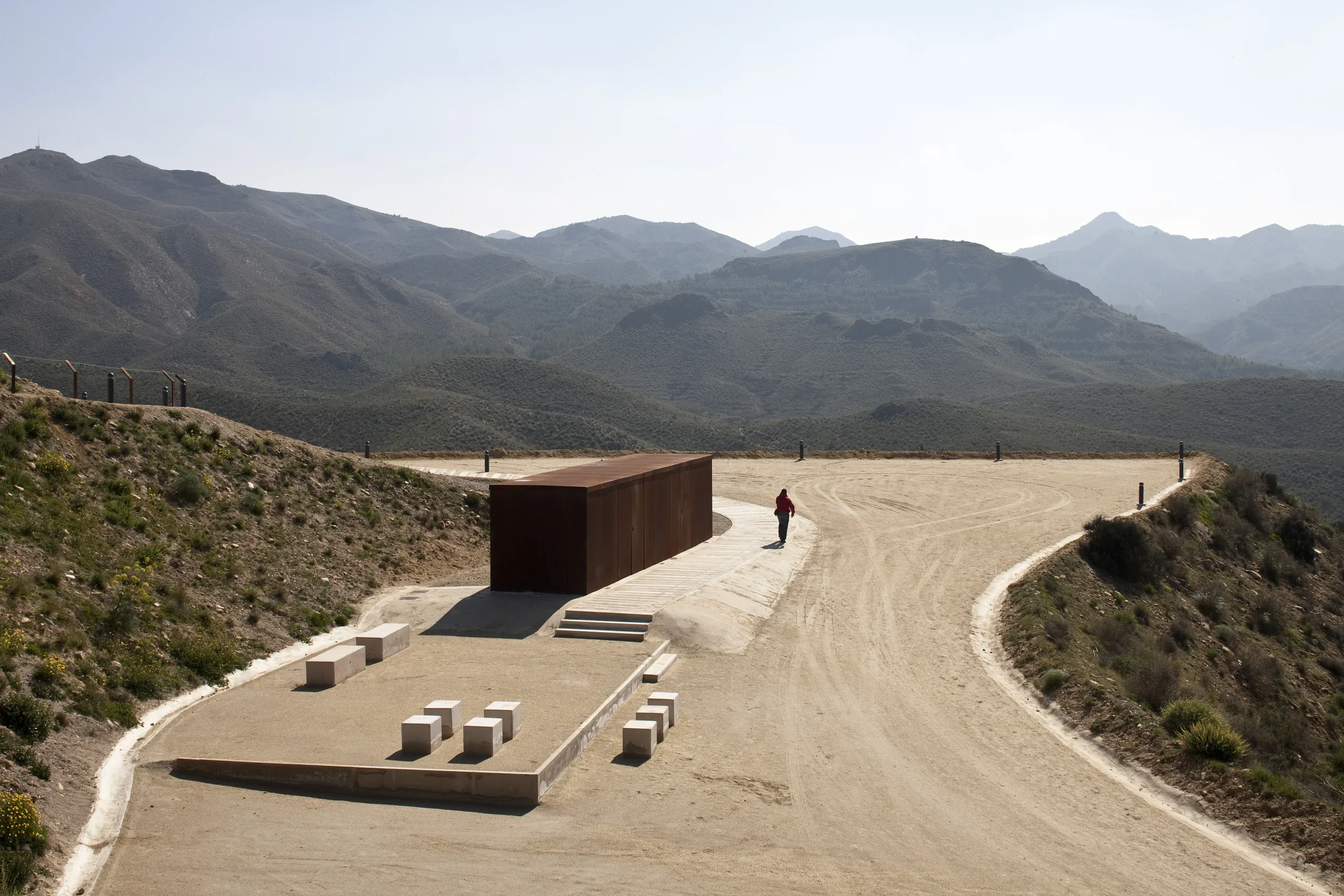 Se utiliza la topografía existente para minimizar la alteración del suelo. El aparcamiento se situa en una meseta existente. La oficina de atención al público se ubica en una caseta monolítica de acero corten. Como un contenedor marítimo, indica su carácter provisional y reversible.